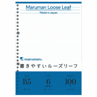 ●ルーズリーフ●規格:B5/26穴(2穴兼用)●サイズ:幅182mm×高さ257mm●罫内容:6mm罫(36行)メモリ入●枚数:100枚●中紙坪量:80g/平方m●中紙厚:105マイクロm