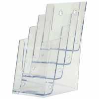 ●パンフレットスタンド●種別:A4判3折4段●外寸:幅122×奥203×高254mm●内寸:1段目=幅108×奥35mm、2段目=幅110×奥30mm、3段目=幅112×奥30mm、4段目=幅115×奥28mm●材質:ポリスチレン●色:クリア