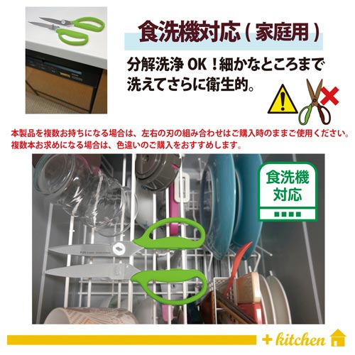 ※冷凍および半解凍食品、骨、蟹や海老の厚い殻、貝殻、餅などの厚い乾燥食品、金属、針金、および金属相当のかたい物を切らないでください。※家庭での使用を目的とした製品です。※たわしや磨き粉で洗うと傷がつく恐れがあります。※品質改善のために、予告なく仕様、カラー等の変更を行う場合があります。予めご了承ください。※漂白、消毒、つけ置き洗いはしないでください。※複数お持ちになる場合、左右の刃の組み合わせは、購入時のままご使用ください。