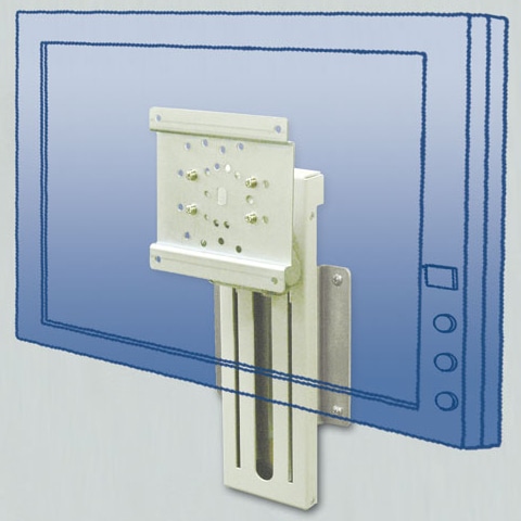 壁・パネルに取り付け画面の高さ位置を150mm範囲で上下昇降させ搭載するための上下角・スイベル機能付 壁・パネル取付用スライドユニットです。(ボディ色:ライトグレー)