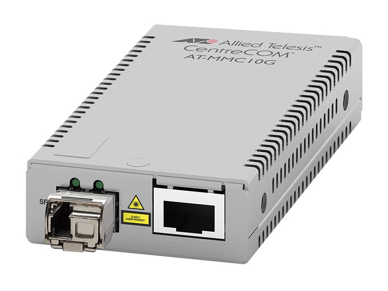 AT-MMC10GT-BD40/LC-12は、AT-MMC10GT/SP と AT-SP10BD40/I-12 を組み合わせたパッケージ製品です。10GBASE-T(RJ45コネクター)と 10G SMF(40km)(LCコネクター)を変換するメディアコンバーターです。対向製品は AT-MMC10GT-BD40/LC-13 (AT-SP10BD40/I-13) です。
