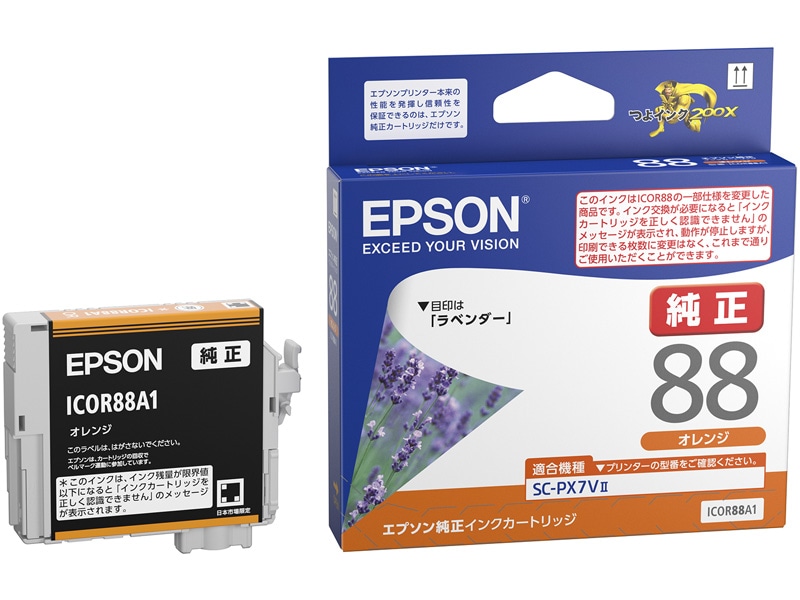 このインクはICOR88の一部仕様を変更した商品です。インク交換が必要になると「インクカートリッジを正しく認識できません」のメッセージが表示され、動作が停止しますが、印刷できる枚数に変更はなく、これまで通りご使用いただくことができます。