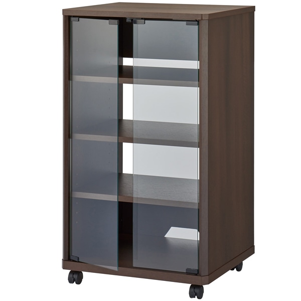 ロータイプ、ハイタイプの2サイズ展開。クリアガラス扉付き。高さ900mm、棚板3枚付属。移動に便利なキャスター付き(内2個ストッパー付)