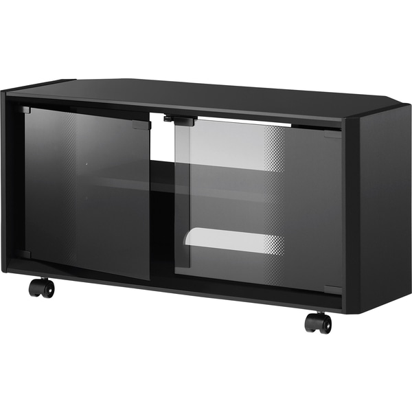 グラデーションガラス扉が印象的な、ブラック光沢テレビ台、26v-32v型対応、転倒防止ロープ、キャスター付、コーナータイプ