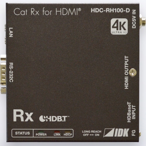 入力されたHDMI信号を、HDBaseT信号に変換しツイストペアケーブル(CAT5e/Cat6:STP)で最大100m伝送する受信器です。映像信号は最大4K@60(4:2:0)の解像度に対応しており、非圧縮、無加工で伝送されるため、画質劣化がありません。またRS-232C双方向通信、LANの伝送にも対応しています。さらにロングリーチモードを使用すると、1080p(24bit)の映像信号を最大150m伝送できます。■送信器とセットで利用します。型番:HDC-TH100-D、その他HDBaseT入力口があるIDK製品(HDCシリーズなど)