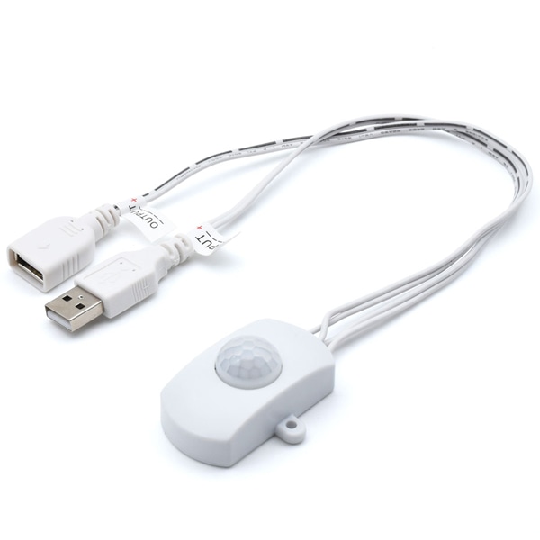 USBでつなぐ人感センサーケーブル。USB電源とUSB機器の間に使用して、動きに反応して機器側のON/OFFが可能。USBLEDライトやUSB扇風機などセンサーでON/OFFできます。(USBケーブルの抜き差しだけで、電源がオンになる機器でご利用頂けます。USB電源が入った後、ボタン操作が必要な機器では本製品のセンサースイッチはご利用頂けません)動きをセンサーで感知してUSB通電を開始、反応がなければOFFにします。(OFFまでの設定時間は15秒~約4分まで設定可能) 人感センサーの検知範囲は左右約120度、距離約5m以内に反応します。USB5V/2Aまでの電源に対応。固定用ビスと両面テープが付属。 ケーブル長:約50cm、カラー:ホワイト