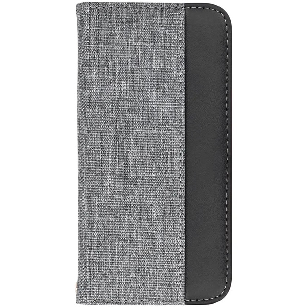 iPhone 14 Pro専用 帆布とPUレザーを縦に合わせたデザイン ファブリック素材+PUレザー手帳型ケース グレー×ブラック 製品サイズ約79.5(W)×19.5(D)×153(H)mm