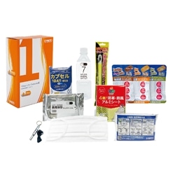 内容品:保存水500ml×1本、エマージェンシークッキー(チョコ・プレーン・抹茶)×各1個、簡易トイレ5回分×1個、アルミブランケット×1個、ウェットティッシュ×1個、簡易ライト×1個、マスク×1枚、ポケットティッシュ×1個、呼子笛×1個