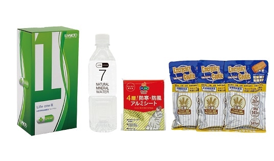 内容品:保存水500ml×1本、エマージェンシークッキー大麦×各3個、アルミブランケット×1個