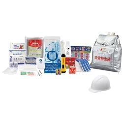内容品:2WAYショルダー&ウェストバック×1個、折りたたみウォーターバック×1枚、簡易救急セット(ハサミ・ピンセット・絆創膏・綿棒)×1セット、エマージェンシークッキー(チョコ・プレーン・抹茶)×各1個、保存水500ml×1本、懐中電灯(電池付)×1個、ローソク(マッチ付)×1個、スベリ止め手袋×1双、ガーゼ×1枚、三角巾×1枚、脱脂綿×1個、伸縮包帯×2包、タオル(ビニール入)×1枚、ポリ袋×10枚、ロープ5m×1本、ポケットティッシュ×2個、冷熱遮断アルミシート×1個、アルミブランケット×1個、マスク×1枚、ヘルメット×1個