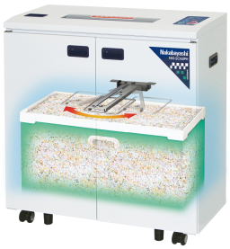 ダブルカット方式を採用。ねじれのない細断紙片で減容を実現し、チップ袋の交換回数を削減。細断時に危険が生じた場合には、投入口上部にある「安全停止スイッチ」を押すと、緊急停止することができます。