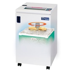 プレス機構搭載でシュレッダ紙片を分散圧縮。安全性にも配慮した安全停止スイッチを搭載し、長寿命カッターユニットで安心の刃物5年間保証付き。