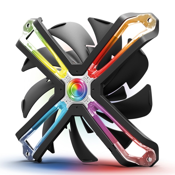 アドレサブルRGB LEDを備えた独自のX型フレーム。独特なLEDパターンを実現するオリジナルのLEDテクノロジー。直進性に優れたエアフローを提供するデュアルブレード構造。バイオミメティクスの応用により振動とノイズを軽減。静音動作と長寿命を実現する流体軸受けを採用。120/140mmの2サイズをご用意。