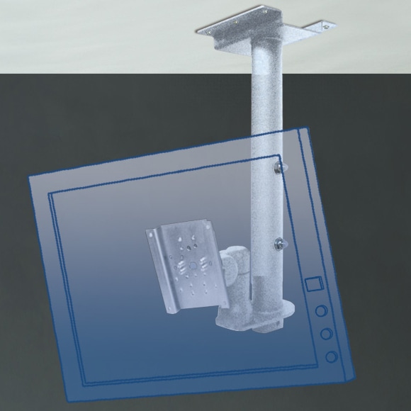 スイベル・上下角機能を持った10Kgまでの小・中型ディスプレイモニター搭載用天吊り金具です。天井面からディスプレイ固定中央部までの位置を457.05~557.05mmまで50mm間隔で3段階選定可能です。