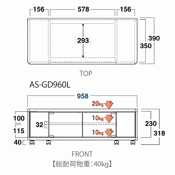 ■TV対応インチ:~43V型■本体重量:15kg■耐荷重:20kg *寸法図内に詳細掲載■寸法:W958mm D390mm H318mm■仕様・強化ガラス+飛散防止フィルム貼りのダブルセイフティー ・ガラス扉+木扉収納スペース ・2色付け替えキャスター(シルバー/クロ)■付属品・テレビ転倒防止部品・キャスタートレイ