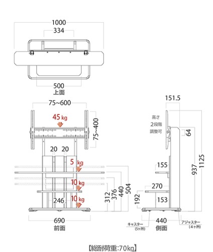 ■TV対応インチ:32~77V型■本体重量:17.5 kg■耐荷重:45 kg■寸法:W1000 x D440 x H1125 mm■仕様●組立品 ●キャスター付き自立スタンド(木製) ●ナチュラル色の本体とホワイト色の棚板■コメント●生活スタイルに合わせて設置できる自立タイプ ●キャスター付きで移動が楽々 ●棚板&シアターバー棚板付属