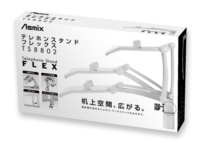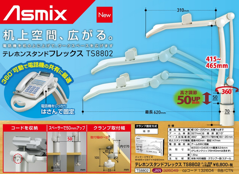 | 商品名 | テレホンスタンドフレックス 適応電話機幅130~220mm、質量1kgまで アーム伸長327mm ベース回転範囲360° 最大クランプ取り付け幅60~20mm |