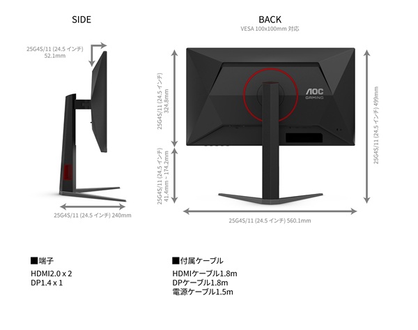 | ケーブル | 電源ケーブル1.5m、HDMIケーブル1.8m、Displayportケーブル1.8m |