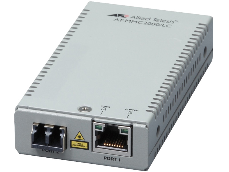 MMC200/MMC2000 シリーズは、10/100/1000BASE-Tツイストペアケーブルと光ファイバーケーブルを変換する単体型メディアコンバーターです。AT-MMC2000LX/LC-N7(RoHS対応)は、10/100/1000BASE-T(RJ45コネクター)と 1000BASE-LX(シングルモードファイバー/2連LCコネクター/最長10km)を変換するメディアコンバーター(アカデミック:デリスタ保守7年付)です。