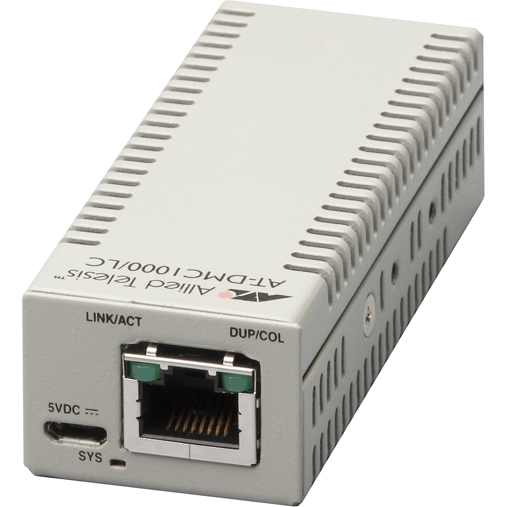AT-DMC1000/LC(RoHS対応)は1000BASE-Tポートと光ポート(LC)を変換する単体型メディアコンバーターです。光ファイバーケーブルは2心のマルチモードに対応しており、DMC1000シリーズ同士を対向で使用することで1000Mbpsイーサネットシステムの接続距離を最長550mまで延長することが可能です。