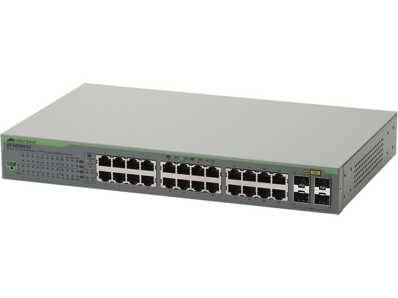 AT-GS950/24-N5(RoHS対応)は、10/100/1000BASE-Tポートを24ポート装備したギガビットイーサネット・スマート・スイッチ(アカデミック:デリスタ保守5年付)です。10/100/1000BASE-Tポートのうち4ポートがSFPスロットとのコンボポートになっています。Web GUIを実装し、Webブラウザーを利用した保守・管理が可能です。