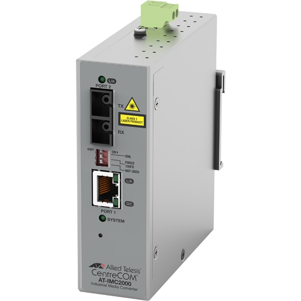 AT-IMC2000T/SCは、10BASE-Te/100BASE-TX/1000BASE-T 対応のRJ45、1000BASE-SX の光ポートをそれぞれ 1 ポート持った、光-電気の信号形態を変換すためのファイバーメディア&レートコンバーターです。