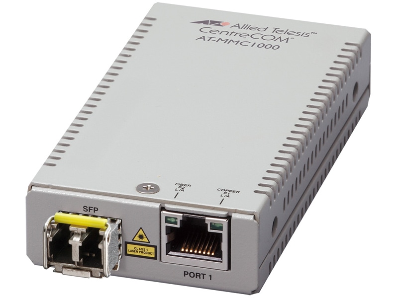 AT-MMC1000ZX120/LCは、AT-MMC1000/SP と AT-SPZX120/I を組み合わせたパッケージ製品です。1000BASE-T(RJ45コネクター)と 1000Mbps 光(シングルモードファイバー/2連LCコネクター/最長120km)を変換するメディアコンバーターです。