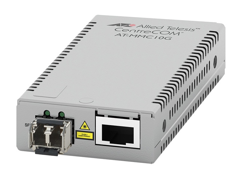 AT-MMC10GT-SR/LCは、AT-MMC10GT/SP と AT-SP10SR を組み合わせたパッケージ製品です。10GBASE-T(RJ45コネクター)と 10GBASE-SR(2連LCコネクター)を変換するメディアコンバーターです。