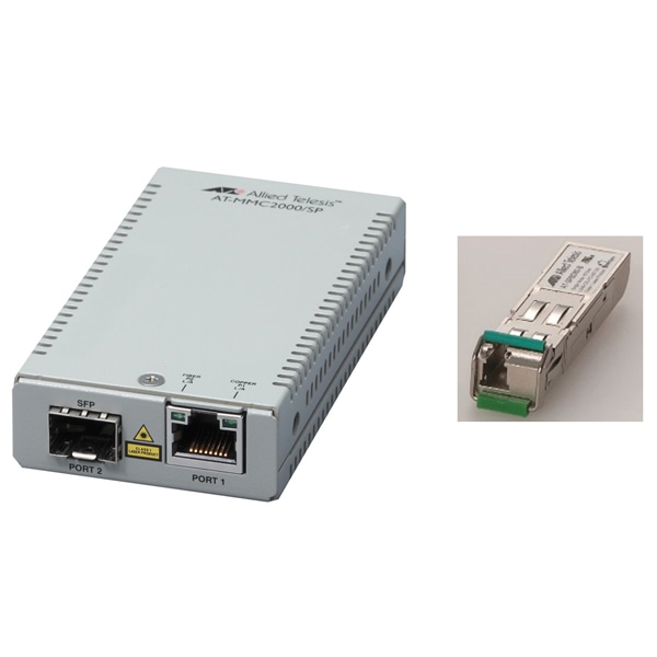 AT-MMC2000BDM/LC-Bは、AT-MMC2000/SP+AT-SPBDM-Bのバンドルパックです。各製品を別々に購入するより安価で購入できます。これは 10/100/1000BASE-Tツイストペアケーブルと光ファイバーケーブル(LCコネクタ)を変換する単体型メディアコンバーターです。光ファイバーケーブルは1心のマルチモードに対応しており、AT-MMC2000BDM/LC-Aと対向で使用することで、1000Mbpsイーサネットシステムの接続距離を最長550mまで延長できます。