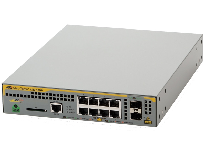 AT-x230-10GP-N7(RoHS対応)は、10/100/1000BASE-Tポートを8ポートとSFPスロットを2スロット装備したレイヤー2plusギガビット・インテリジェントPoE+スイッチ(アカデミック:デリスタ保守7年付)です。10/100/1000BASE-TポートはIEEE 802.3at準拠のPoE+機能を搭載しており、1本のイーサネットケーブルで通信データと大容量電力供給を可能にします。