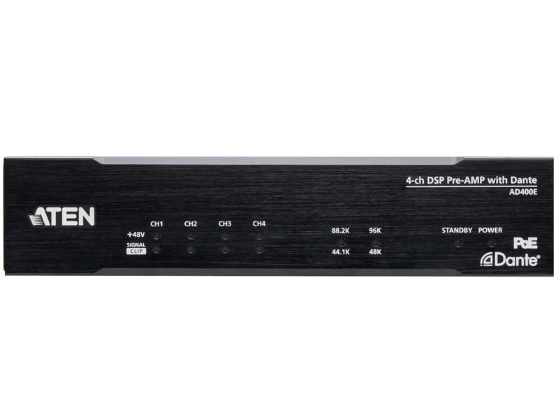 AD400Eは、4チャンネルのバランス/アンバランスマイク/ラインレベルオーディオ信号をDanteパケットに変換するプリアンプ機能を備えたインターフェースです。AES67準拠にも準拠し、Audio over IP デバイス間の相互運用性を強化し、効果的なプリアンプ処理を可能にするだけでなく、ATENプロオーディオモデルと連携して分散DSPシステムを実現します。レイアウトの柔軟性を高め、全体的なコストを削減し、アプリケーションを拡大します。役員室、会議室、レストランやバーなど、Danteネットワーク技術を利用したプロフェッショナルなオーディオシステムに適しています。