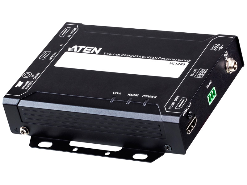 VC1280は、HDMI/VGAソースデバイス各1台をHDMIインターフェースのディスプレイやプロジェクター1台に接続できるユーザーフレンドリーな製品です。VC1280はHDCP 1.4およびHDMI(3D、Deep Color、4K)に準拠しており、最大4K(3840×2160@30Hz)の解像度に対応しています。さらに、VGA信号を外部アダプターやスケーラーを使用せずにHDMI信号に変換して出力できる「VGA変換機能」を搭載しています。