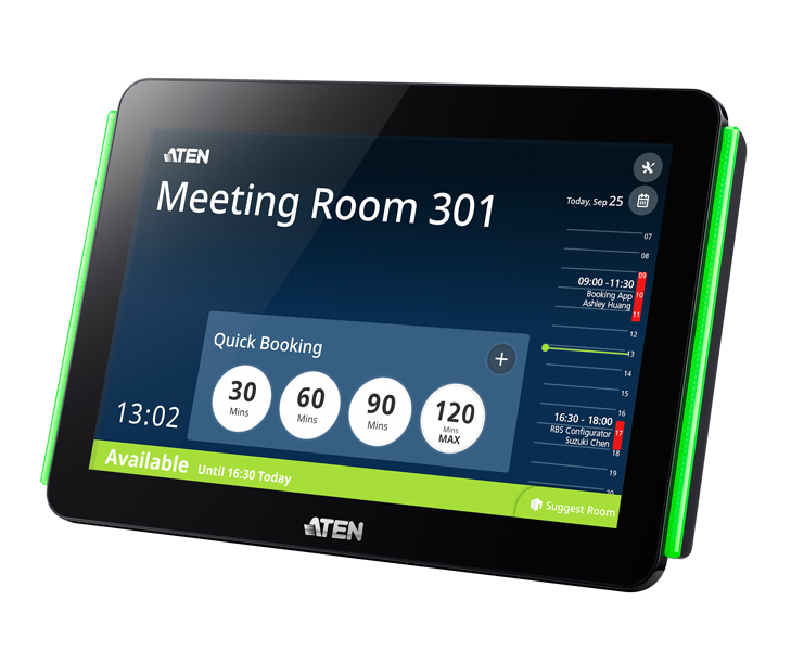 VK430は、会議室の予約管理が行える10.1インチ タッチスクリーンパネルです。ユーザーはパネルを数回タップするだけで、会議室を簡単に予約することができます。また、関連ソフトウェアであるATEN RBS コンフィギュレーターと併用することで、システム内のすべての会議室のスケジューリングと割り当ての統合管理が容易に実現できます。会議室の利用状況を点灯色で示す本体内蔵LEDライトバーやカレンダーサーバーとのリアルタイム同期機能などを活用することによって、会議室利用の効率化が期待できます。
