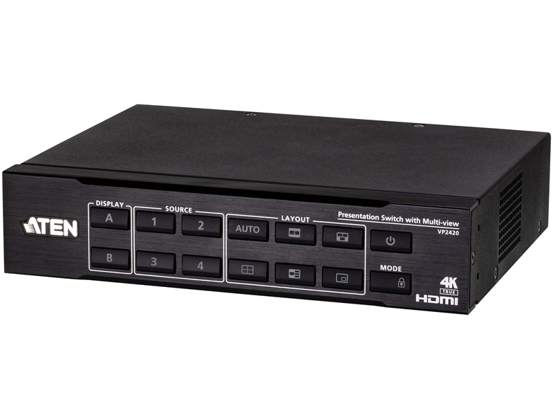VP2420は、4K60p解像度とマルチビュー表示に対応した4入力2出力HDMIプレゼンスイッチャーです。複数のソースをスムーズに切り替え、2画面を使って複数レイアウトで映像を出力することができます。会議室における複数画面を使用した情報分析や、ビデオウォールを使ったモニタリングなどで活用することで、シームレスなチーム連携と効率的な意思決定を実現します。