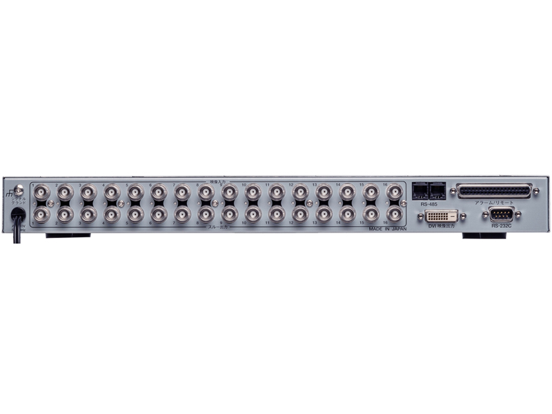 アナログHDカメラを16台接続し、DVI-D出力より映像を出力するマルチビューワです。映像入力はAHD/HD-TVI/HD-CVIおよびNTSC映像信号に対応しており、各種フォーマットの混在も可能です。単画面/4分割/9分割/13分割/16分割表示に加え、オートシーケンス表示も可能です。アラーム/リモート入力端子、RS-232C/RS-485端子を装備。また、専用アプリケーション経由で漢字タイトルの挿入も可能です。