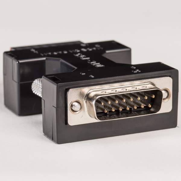 15ピン・オスのD-subコネクターピンから端子台への変換装置。端子台はプッシュ式で1.5m㎡の線材まで対応。D-subコネクターの煩わしい半田付けが不要です。