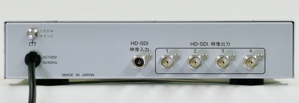 3G-SDI、HD-SDI、SD-SDIのSDI信号に対応した1入力を4分配にする映像分配機です。エンベデッドオーディオ信号、アンシラリデータ等は加工せずに出力されます。イコライザ・リロック機能を搭載しているので、同軸ケーブル(5CFB)で最大200mまでの伝送が可能です。またリピータとしてご使用することも可能です。