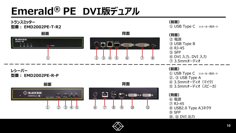 ●IP-KVM EmeraldシリーズのDVI-D対応レシーバ デュアルモニタ対応 ●RJ-45x1、SFPx1 でネットワーク冗長可能 ●USB HID、トランスペアレント USB(2.0)、オーディオに対応 ●KVM over IP で、物理マシンと仮想マシンのコンソールを延長・切替 ●1 対 1 から N 対 N まで柔軟にレシーバとトランスミッタを組み合わせ可能 ●IP 接続により、レシーバとトランスミッタ間の実質的な距離の制限なし ●管理マネージャーBoxilla との併用で各デバイスの通信状態の監視やリブート、ユーザ管理が可能 ●保証: センドバック無償2年