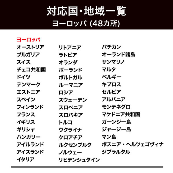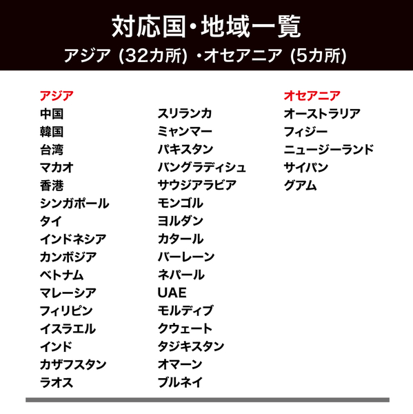 世界135か所対応:ヨーロッパ(48か所)、アジア(32か所)、オセアニア(5か所)、北米(19か所)、南米(17か所)、アフリカ(14か所)