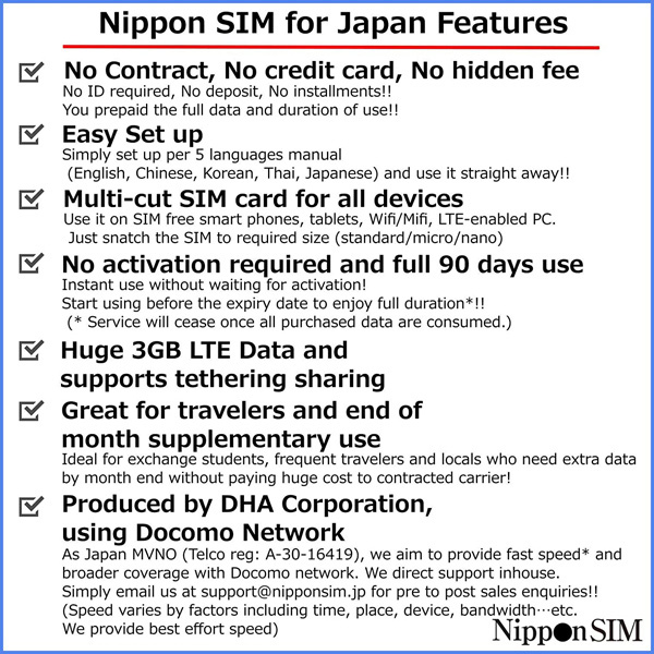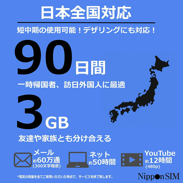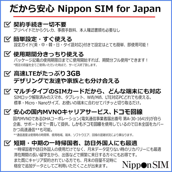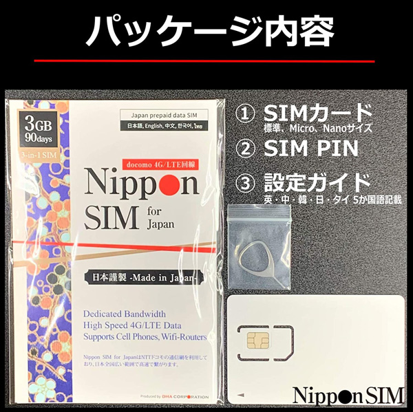 Nippon SIM for Japan 標準版 90日3GB 日本国内用 ドコモ回線 プリペイドデータSIMカード(事務手続一切不要・SIMカード同梱・簡単設定/即利用OK)