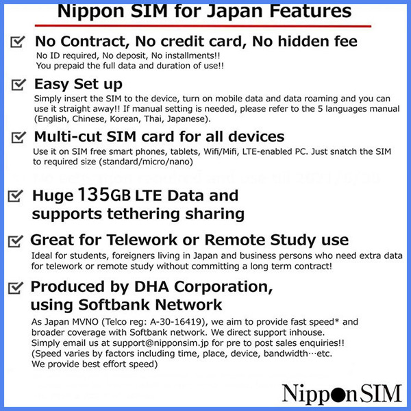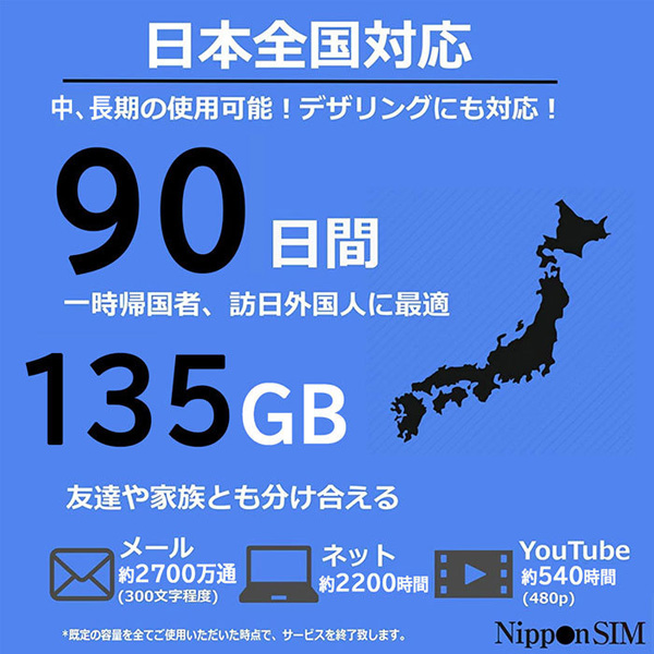 Nippon SIM for Japan 標準版 90日135GB 日本国内用 ドコモ回線 プリペイドデータSIMカード(事務手続一切不要・SIMカード同梱・簡単設定/即利用OK)