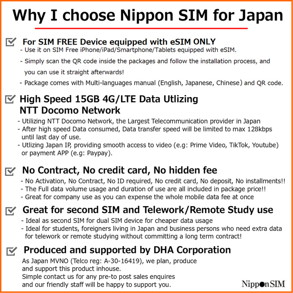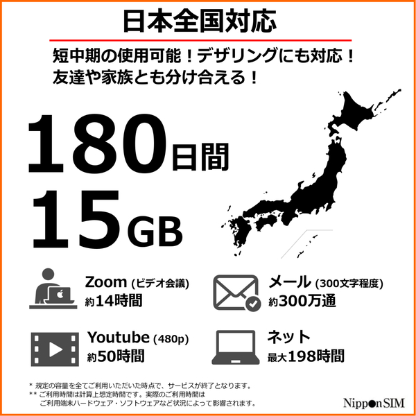 | 商品名 | 【eSIM端末専用】Nippon SIM for Japan 180日 15GB 日本国内用プリペイドデータ eSIM (ドコモ回線) 事務手続一切不要・QRコード同梱・簡単設定/即利用OK |