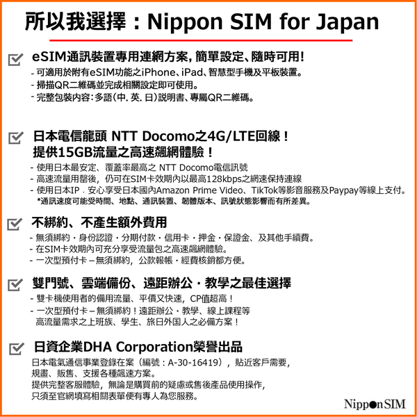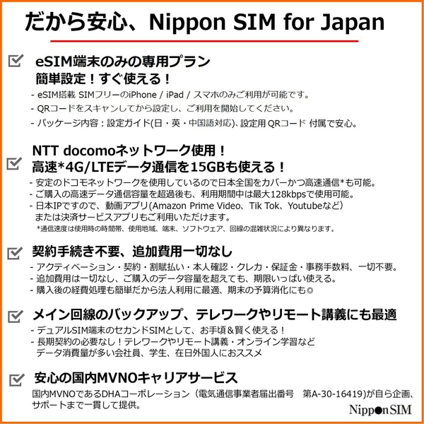 【eSIM端末専用】Nippon SIM for Japan 180日 15GB 日本国内用プリペイドデータ eSIM (ドコモ回線) 事務手続一切不要・QRコード同梱・簡単設定/即利用OK