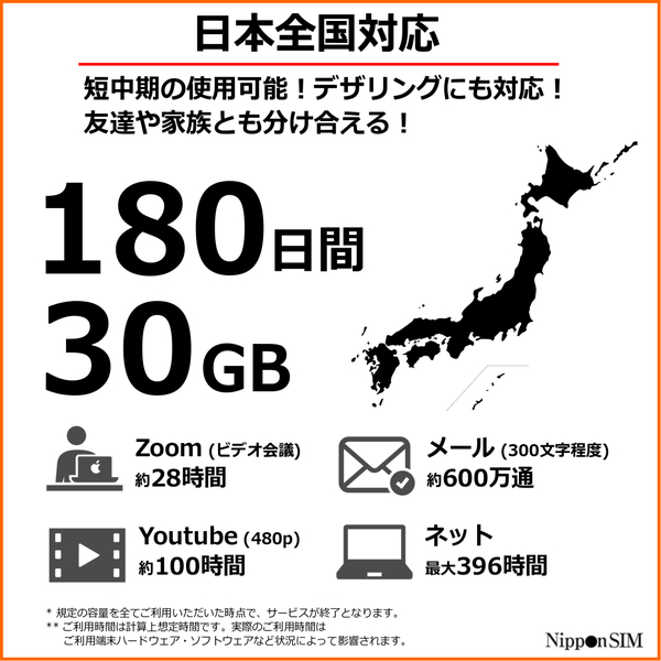 | 商品名 | 【eSIM端末専用】Nippon SIM for Japan 180日 30GB 日本国内用プリペイドデータ eSIM (ドコモ回線) 事務手続一切不要・QRコード同梱・簡単設定/即利用OK |