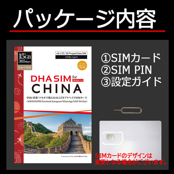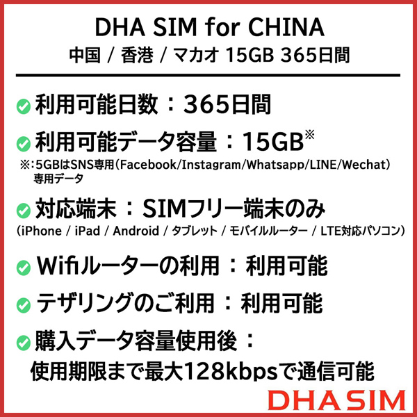| 商品名 | DHA SIM for CHINA 中国/香港/マカオ 365日 15GB プリペイドデータSIMカード |