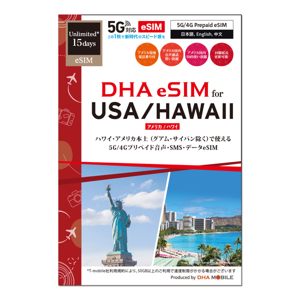 【eSIM端末専用】DHA SIM for USA アメリカ用 15日無制限プリペイド 音声データ eSIM 5G/4G/LTE回線