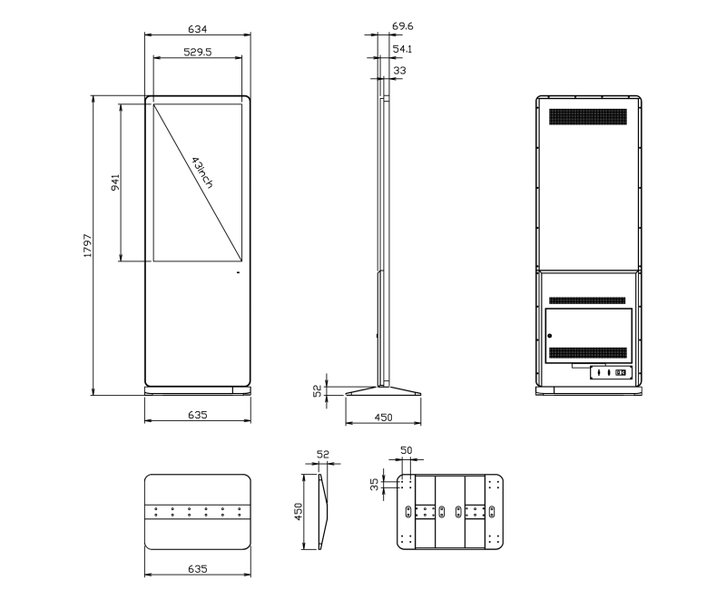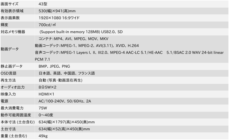 ◆屋内サイネージディスプレイ(キオスクタイプ)エントリーモデル 43型◆USBを挿すだけで簡単再生◆別途メディアプレイヤー併用で更に充実したコンテンツ配信が可能◆キャスター付きで移動も簡単◆700cd/m^2のフルHDディスプレイ◆最大消費電力:75W◆解像度:1920×1080◆外形寸法(土台含む):(W)634×(H)1797×(D)450 mm◆質量(土台含む):49kg