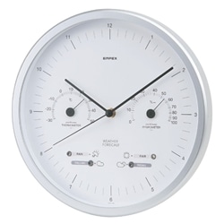 4色のLEDランプが光って半径20㎞圏内の半日後のお天気をお知らせします。温・湿度計つきのお天気時計。シンプルなシルバー調。