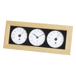 リビングで実用的なインテリアとしておすすめの、ナチュラルな木枠の温度・湿度・時計。置き掛け兼用。