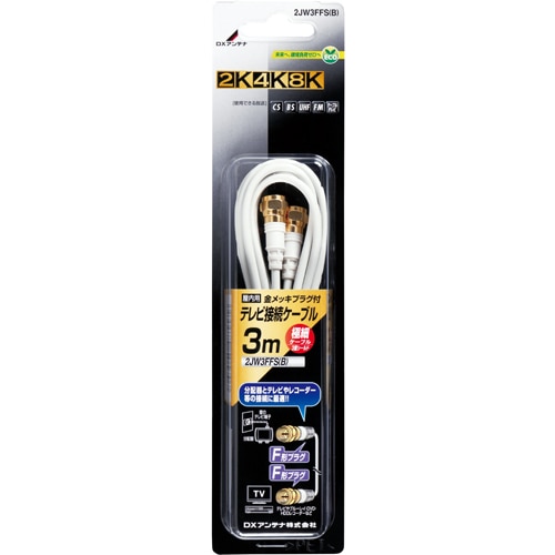 ■高シールド低損失ケーブル採用により2K・4K・8K放送に対応 ■テレビ裏の狭いスペースでも配線しやすい極細ケーブル使用。 ■両端F形プラグでしっかり接続。 ■分配器とテレビやチューナー付きパソコンなどの接続にお勧めです。 ■3重シールドケーブルとシールドプラグ採用だから妨害波に強い ■金メッキプラグにより接触不良を防ぎます ■ケーブル色、ホワイトタイプ。 ■ケーブル長3m ■周波数帯域:10~3224MHz 2K4K8K放送対応 ■ケーブル:2C 3重シールド ■プラグ:F形プラグ + F形プラグ ■インピーダンス:75Ω ■長さ:3m ■色:ホワイト